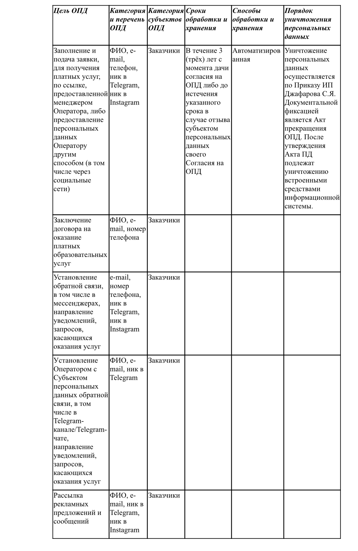 1.5. К обрабатываемым персональным данным Субъектов персональных данных, в соответствии с настоящей Политикой, относятся персональные данные заказчиков, заполнивших форму по ссылке, предоставленной менеджером Оператора, либо предоставивших персональные данные Оператору другим способом (в том числе через социальные сети) (далее – «Сведения»): ФИО, e-mail, номер телефона, ник в Telegram, ник в Instagram.