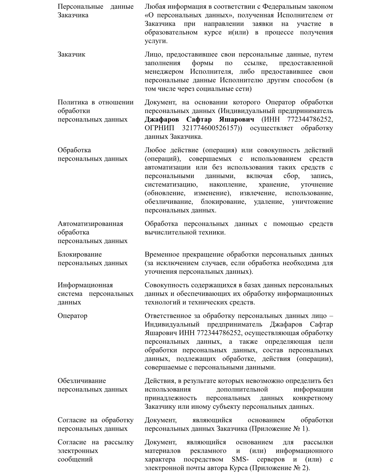1.3. Лицо, организующее и (или) осуществляющее обработку персональных данных, а также определяющее цели такой обработки, состав персональных данных, подлежащих обработке, действия (операции), совершаемые с персональными данными – Индивидуальный предприниматель Джафаров Сафтар Яшарович ИНН 772344786252.
